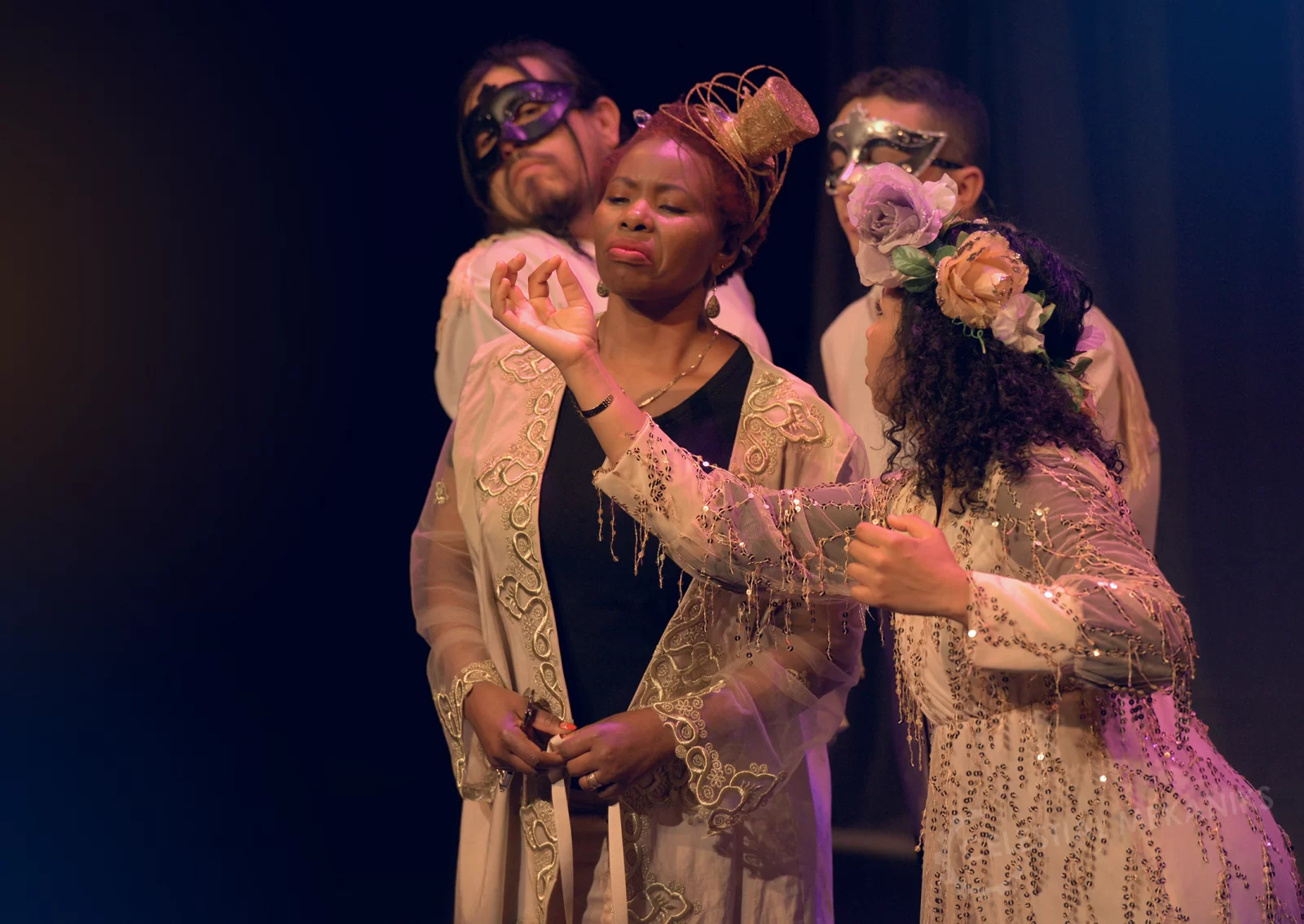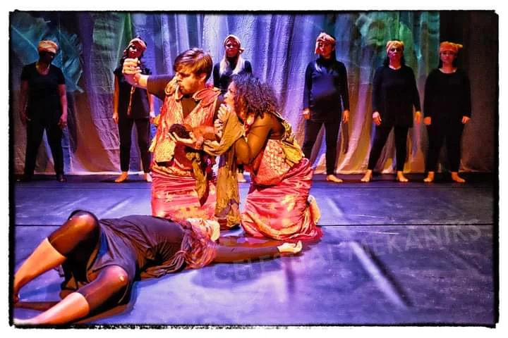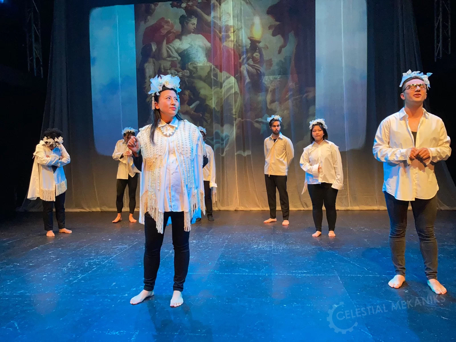 The "blue hour" is the moment just before the sun rises. There is a strange glow in the air and audible silence. Three paintings related to dawn are brought to life by the actors. Time plays a game. Present and past are mixed like colours on a painter's palette. The actors play stories and give their own interpretations of the artworks in the language of their new home: Dutch.